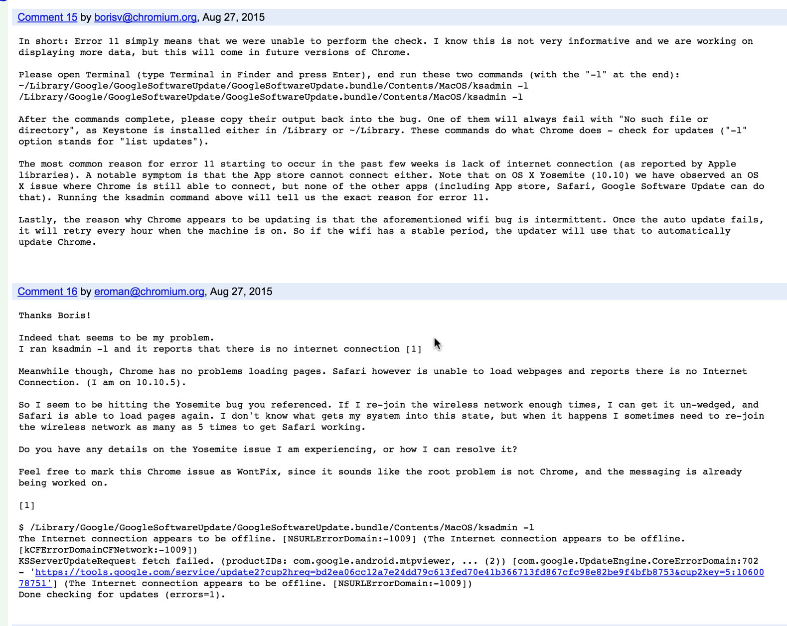 You original statement said "I am trying to update my version of Chrome on my iMac and every time I try and do so I keep getting an error message saying that the update has failed and I get error code 11."