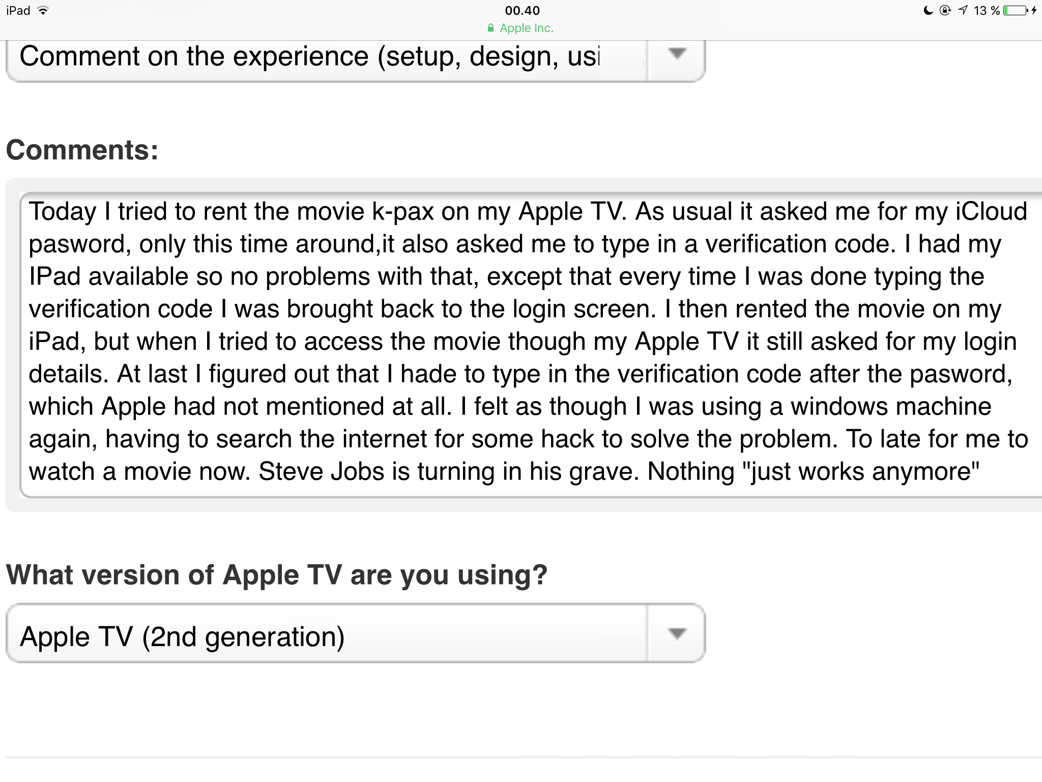 after updating my iPhone I was asked to use the double authentication code, I had no idea of what kind of nightmare this is. I spent hours going from a device to another checking passwords and authentication codes. The last one is the Apple TV, after this stupid innovation my appleTV keeps asking for my AppleID, password and authentication code, and than goes back to the request for the appleID. Basically my AppleTV is useless. how can I eliminate the stupid authentication code, that makes all my devices basically inaccessible?