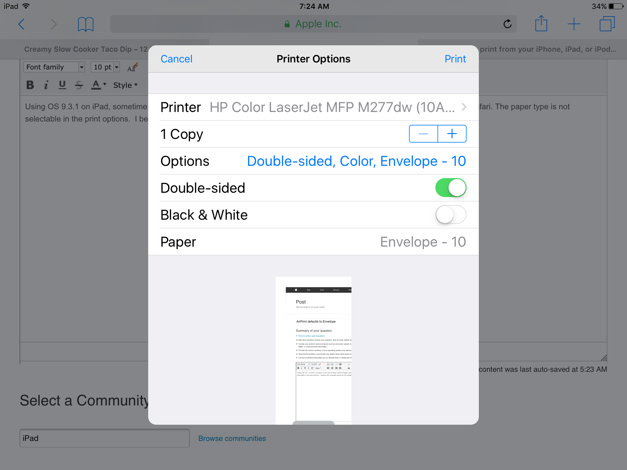 Using iOS 9.3.1 on iPad 2. Sometime in the last 30 days, AirPrint began defaulting to Envelope as paper type when printing from Safari. The paper type is not selectable in the print options. I believe this changed during an iOS update or patch. Any ideas on how to fix this?