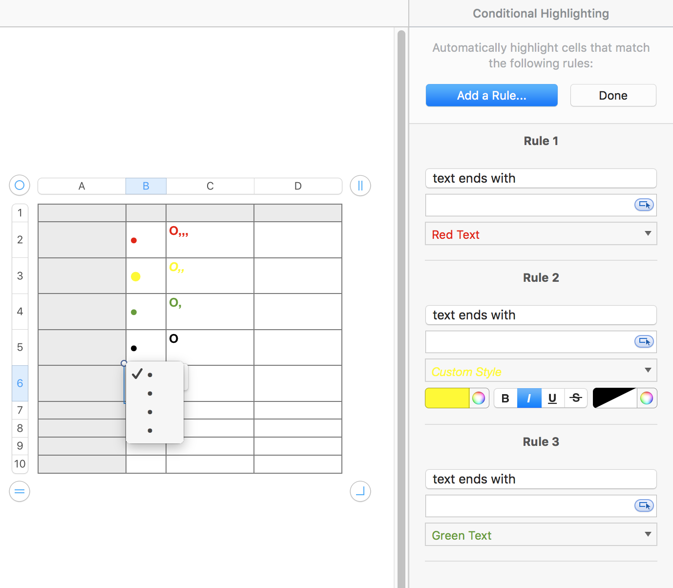 The image below shows the conditional highlighting rules for column B, where the menus contain bullets and spaces. As can be seen, the spaces are not visible in the rules. There are three in the first rule, two in the second, and one in the third.