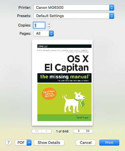 HI there....I have the same problem as original person who started the discussion. My issue is that the 'Show Details' or 'Hide Details' button no longer exists. It is just the PDF button on the left and the cancel/print button on the right. Can I get the Details button back? Otherwise I can never access the grayscale or black/white option. I have a Canon MX922 prints and using Sierra OS