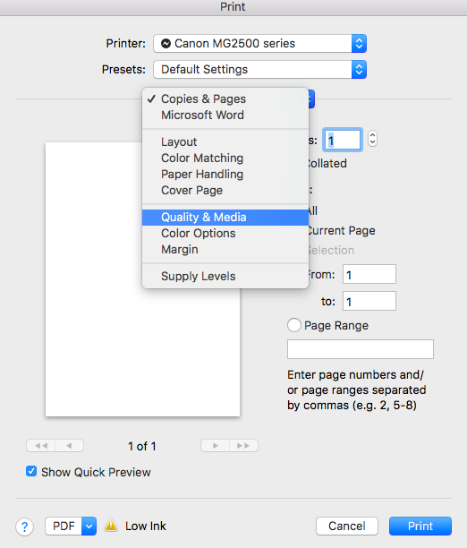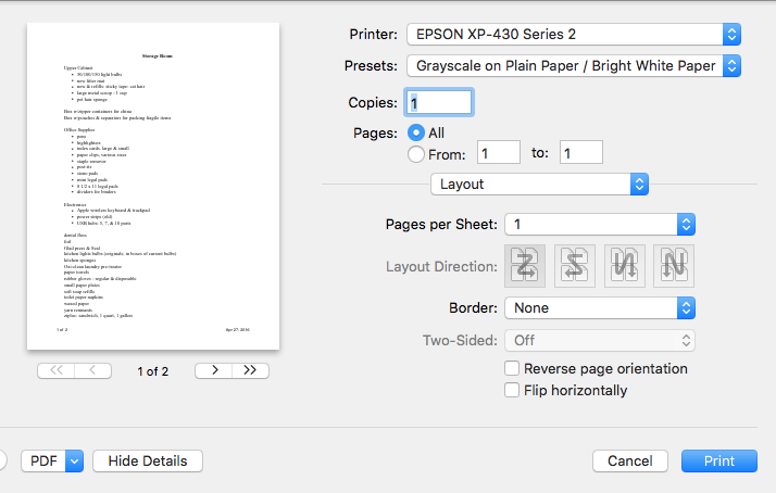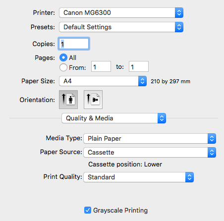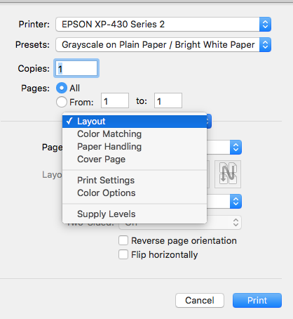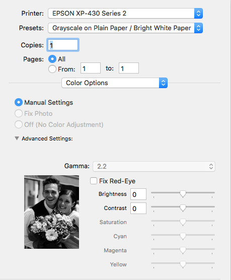 I have a new printer, an Epson XP 430. My previous printer was also an Epson. With my old printer, when I chose Print (for a document, web page, etc.) the dialog box always had an option to choose black & white. I was also able to add to the presets and change the presets.