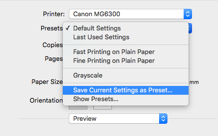 I'm not sure I understand. I am in the printer dialog w/the printer selected. I choose print and the dialog box opens, where you select which pages you want to print (or all), how many pages, etc. The top line in that box is a drop-down lets you choose the printer; I only have the one so that's what is shown. The next line is also a drop-down and it's labelled Presets. From there you can choose which of the presets you want to use; Default Settings, Last Used Settings, Save Current Settings as Preset, etc. but there's no way to customize your settings or pick and choose your settings so as to save new settings. The last line in the dialog box is Show Presets. But when I view the presets, there isn't an option to add a new preset or modify an existing preset. It does show options to delete a preset or duplicate a preset but those options are greyed out.