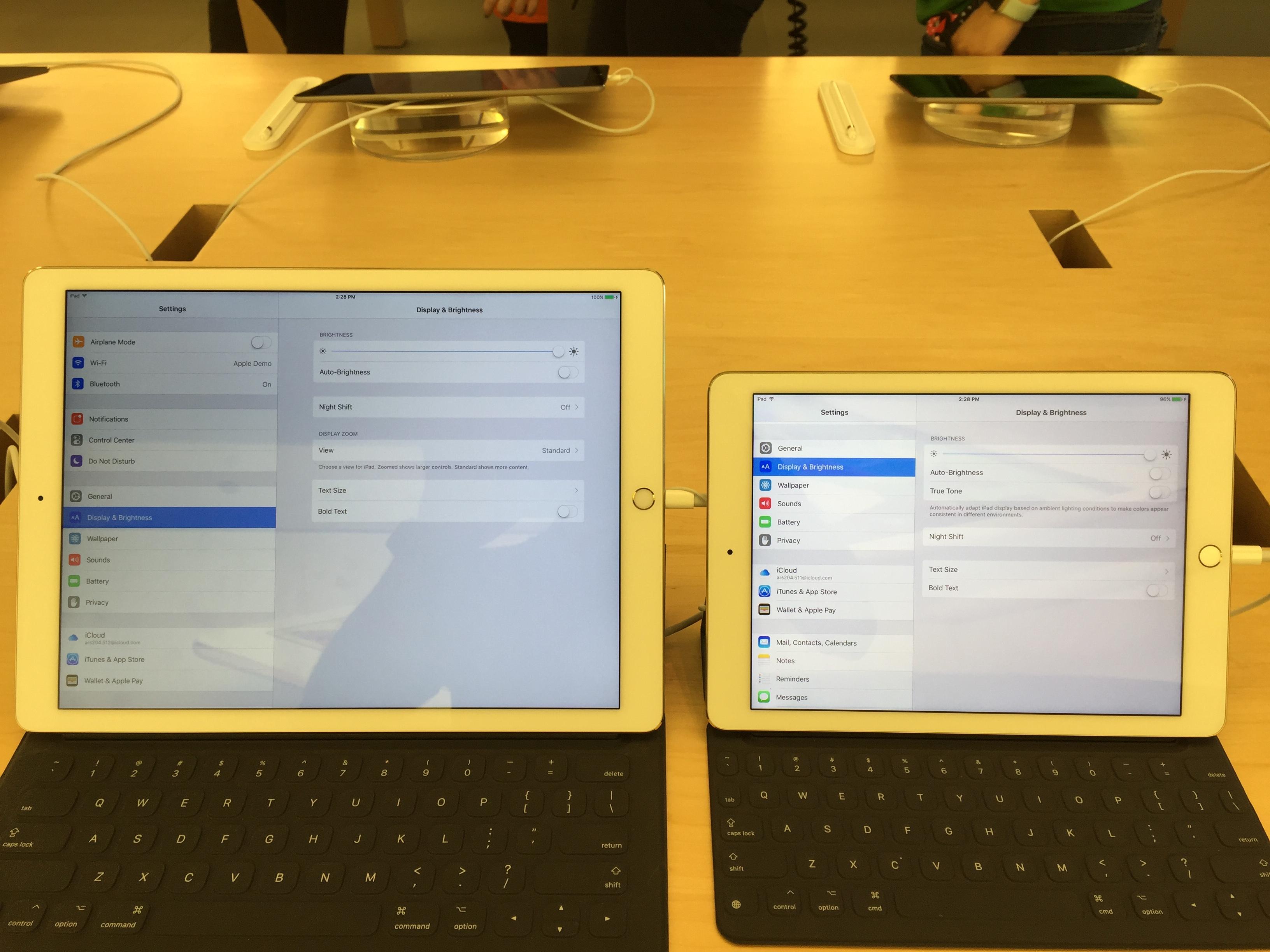 While comparing screens at the Apple Store, I noticed all the 12.9" Pros on display had faded screens compared to the new 9.7" Pros, the iPad Air 2, and my own iPhone 6 Plus. I made sure True Tone was off and all display settings were equal. I compared using the calendar app, as the difference was more obvious with a white background. Apple staff were unable to explain the brightness difference, which was seen on the new 9.7" Pro, the older IPad Air, and my own phone. One staff member cited the 9.7" Pro's newer screen technology as the cause, but that doesn't explain why the Air 2 and my iPhone 6 were also brighter.