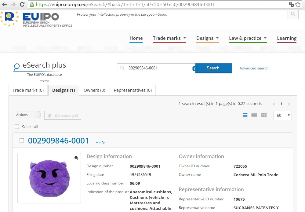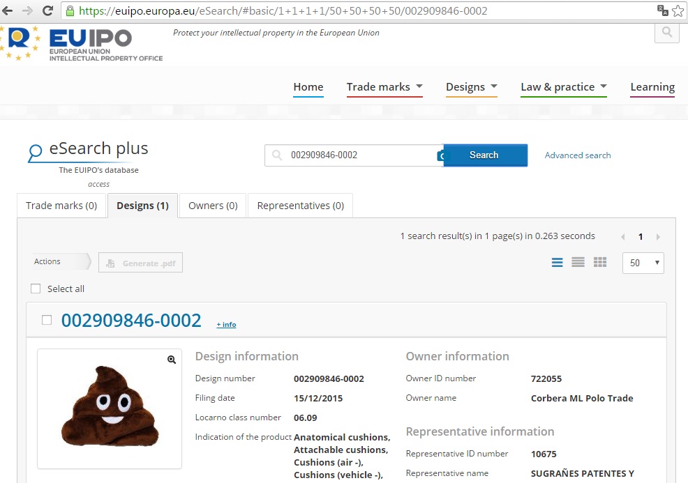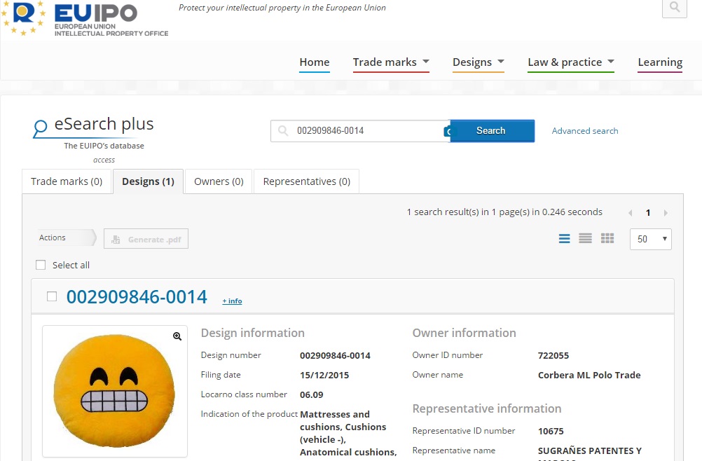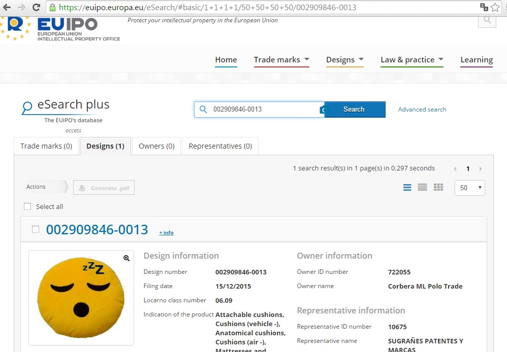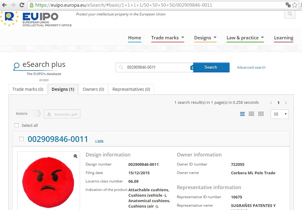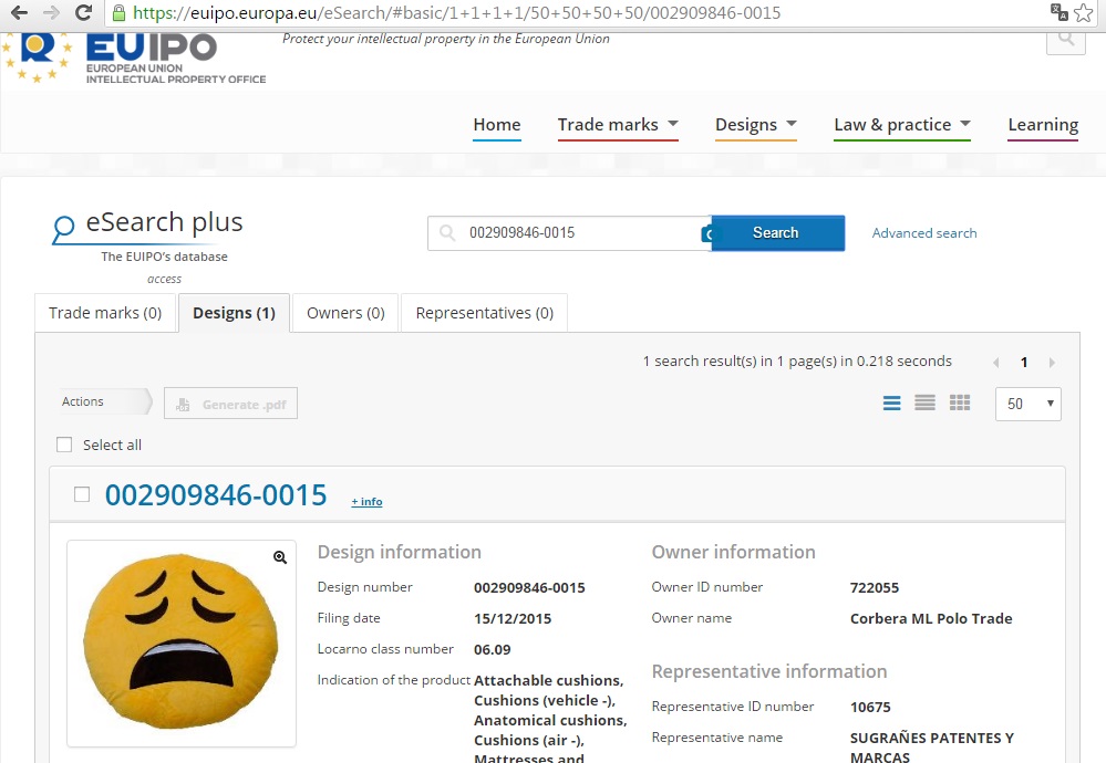 Hello, i have a electronics shop and since some time i am selling 3-4 emoji pillows per week. Today I have recieved a letter from a company called Polo Trade (spain) that says that have patented all Apple emojis. You can see in European Union Intellectual Property web that have patented all designs of different emojis. This company threatened to denounce me if I dont stop to selling these pillow emojis.