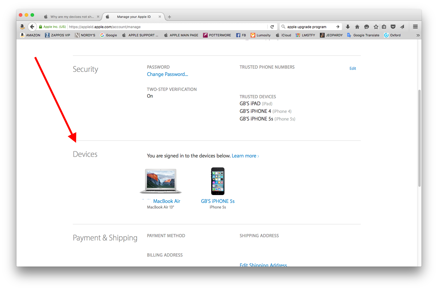 I went here.....Sign in to your Apple ID account page, then scroll to Devices. If you don’t see your devices right away, click View Details and answer your security questions. Click any device name to view that device's information, such as the device model, serial number, and OS version. The information may vary depending on the device type.