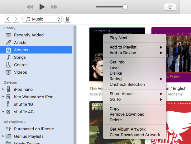 However, if you put your music library into Albums view (to show the view with album artwork "tiles" in a grid), I noticed that you can right-click on an album and Get Album Artwork. I think that applies to all songs on the selected album (or albums). I suppose that makes "some" sense, since missing album artwork is usually for all songs on the album.