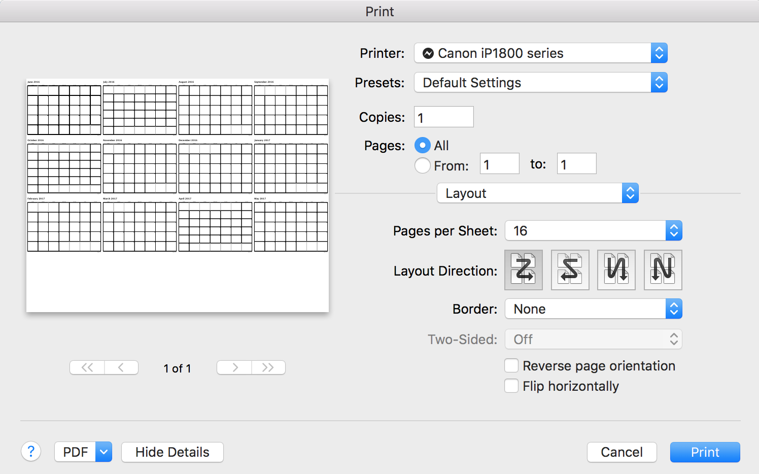 Mine will place 1, 2, 4, 6, 9, or 16 pages on a sheet of US letter size paper, so you would be able to fit May '16 to July '17 onto one sheet. You might have some difficulty reading the dates, though, as the type size is fairly small to start with. I didn't see any place to choose page orientation, and the default is portrait, rather than portrait.