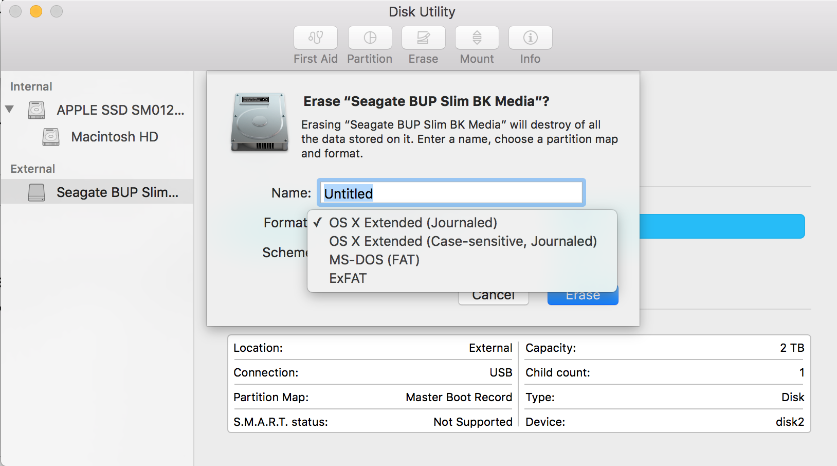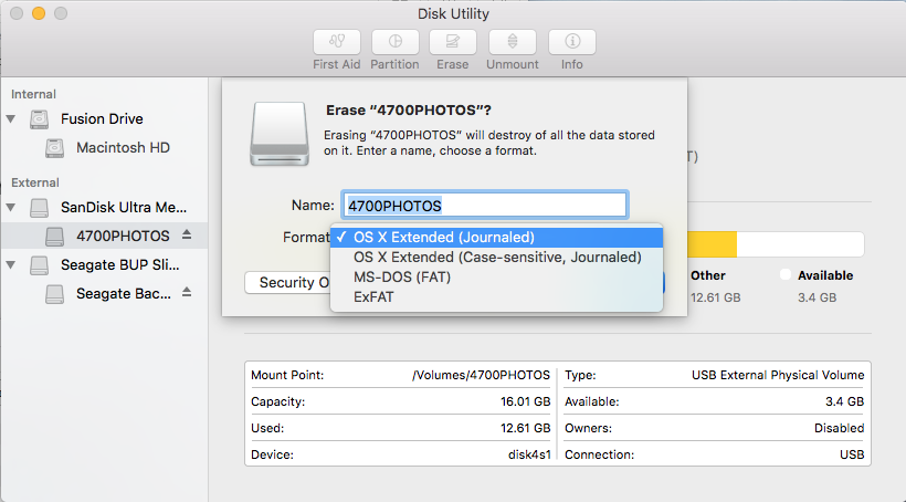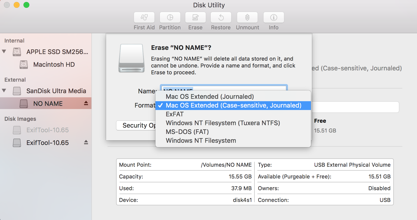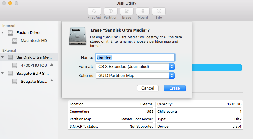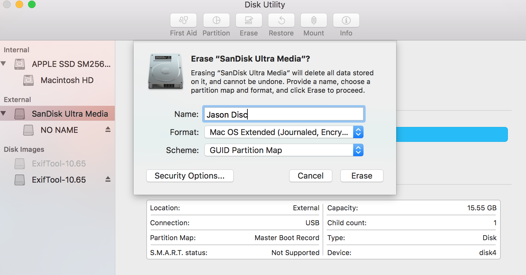 2) Erase the USB using the diskutil 'eraseDisk' command.