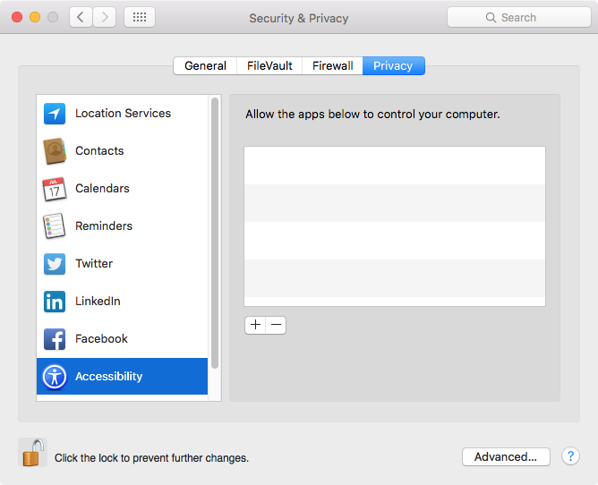 System Preference, Security & Privacy, Accessibility - Not Working/Empty