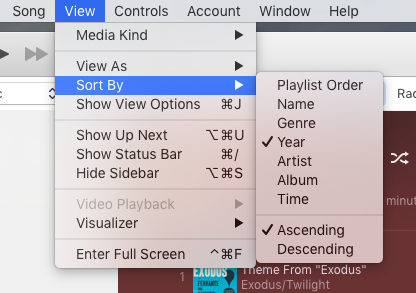 Clicking that same column header a third time will change the name of the column to Album by Artist/Year. This sorts the albums alphabetically by artist, then sorts the albums within each artist chronologically instead of alphabetically. I think this is what you want. This option is not within a menu, but is accessed by repeatedly clicking the Album column header. Hope this helps!