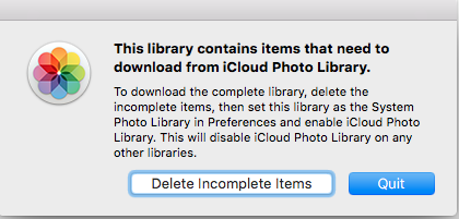 After choosing which library I want Photos to come from (my MacBook Pro has been deleted and reformatted multiple times in the past two weeks due to a faulty external HD, and I this week I used Migration Assistant to bring EVERYTHING back because the Home Folder repair/rebuild at the Apple Store last week left me missing vital information I need for work), even though I thought Photos had already been rebuilt, I got the pop-up seen above. I also got it once last week when I was at the Apple Store. If I choose Delete Incomplete Items, will I lose anything? What does it even mean? Does this mean that it started to download the complete library and then was interrupted? I thought that what I'd be opening would be coming from what had been saved on my external HD.