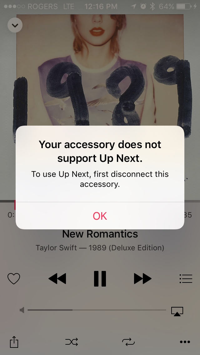 When connected to my Toyota Rav4 music console through the USB cable Apple Music App on my iPhone 5s not not permit me to use the Up Next feature to view or modify the playlist. Two things are observable: (1) if I try to view the Up Next list I get the error "Your accessory does not support Up Next. To use Up Next, first disconnect this accessory." (see picture below) (2) For a song in the song menu from the 3 dots there is not option to add the song to up next.