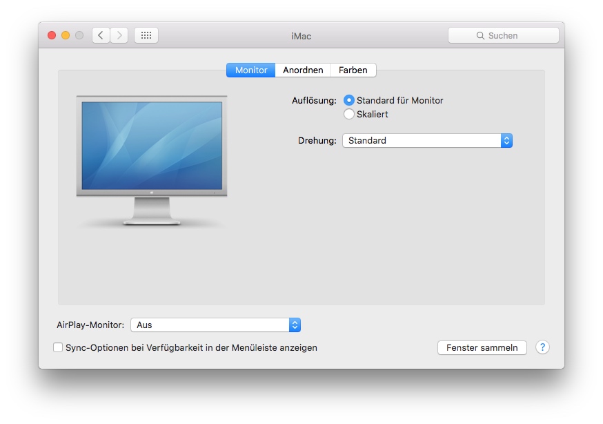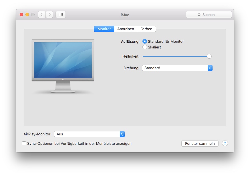 Now, when I press CMD+F2 at the iMac, the iMac gets used as a second display as intended, but it goes really dark! It's not black, you can still see the desktop but on a bright day it's really hard to see anything. Now this is pretty annoying, but the second part of the issue makes it a pain in the ***. When the iMac is dark, I always go to the system preferences and open the settings for the displays. I can see a window with the settings for the iMac, but there is no slider for the brightness! There is no way to make it brighter!