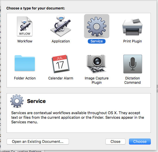 In addition I am also unable to add a service to the System Preferences / Keyboard / Shortcuts, services.
