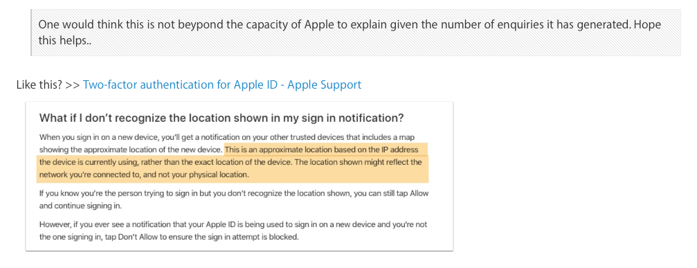 More of the same here. I'm in Adelaide but the two-factor authentication on my Mac Book Air thinks I am in Sydney. OK I understand about the approximate location based on IP thing but if I go into icloud.com and ask where my Mac Book Air is it knows the house it's in.
