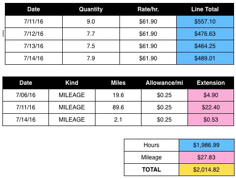 I need a little help with an invoice template. I am trying to get the upper blue column to automatically sum into the lower blue cell. The upper pink column to sum into the lower cell. Then the two lower blue and pink cells sum into the yellow cell for a final total.