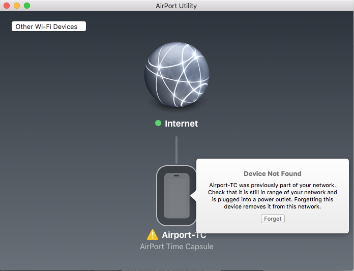 Up until last evening I was able to see and edit my TC through the airport utility on my MBP or my iPad Air 2. Now I have received a message in airport utility that says my TC is no longer part of my network and is no longer accessible.