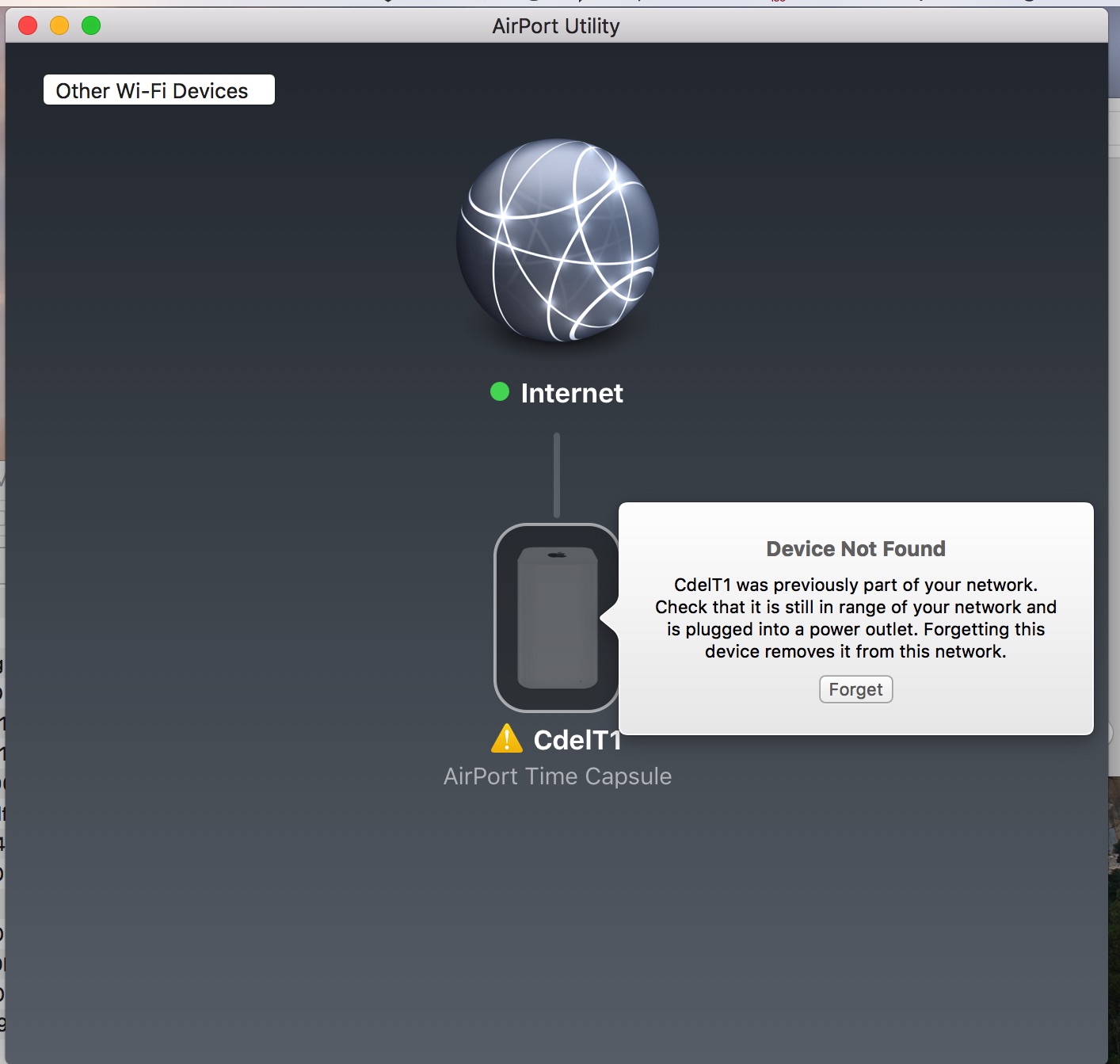 All of the sudden I cannot connect to the airport time capsule. When I initiate airport utility, there is an orange exclamation point/triangle that has the description "device not found". The router is clearly working, since I am connected to the internet (as we speak).
