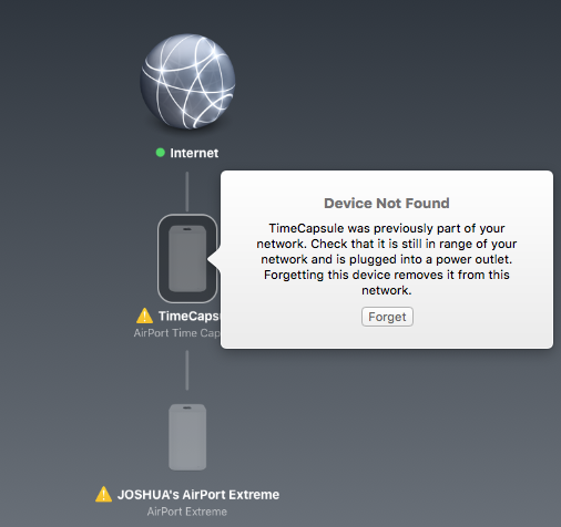 All of the sudden I cannot connect to the airport time capsule. When I initiate airport utility, there is an orange exclamation point/triangle that has the description "device not found". The router is clearly working, since I am connected to the internet (as we speak).