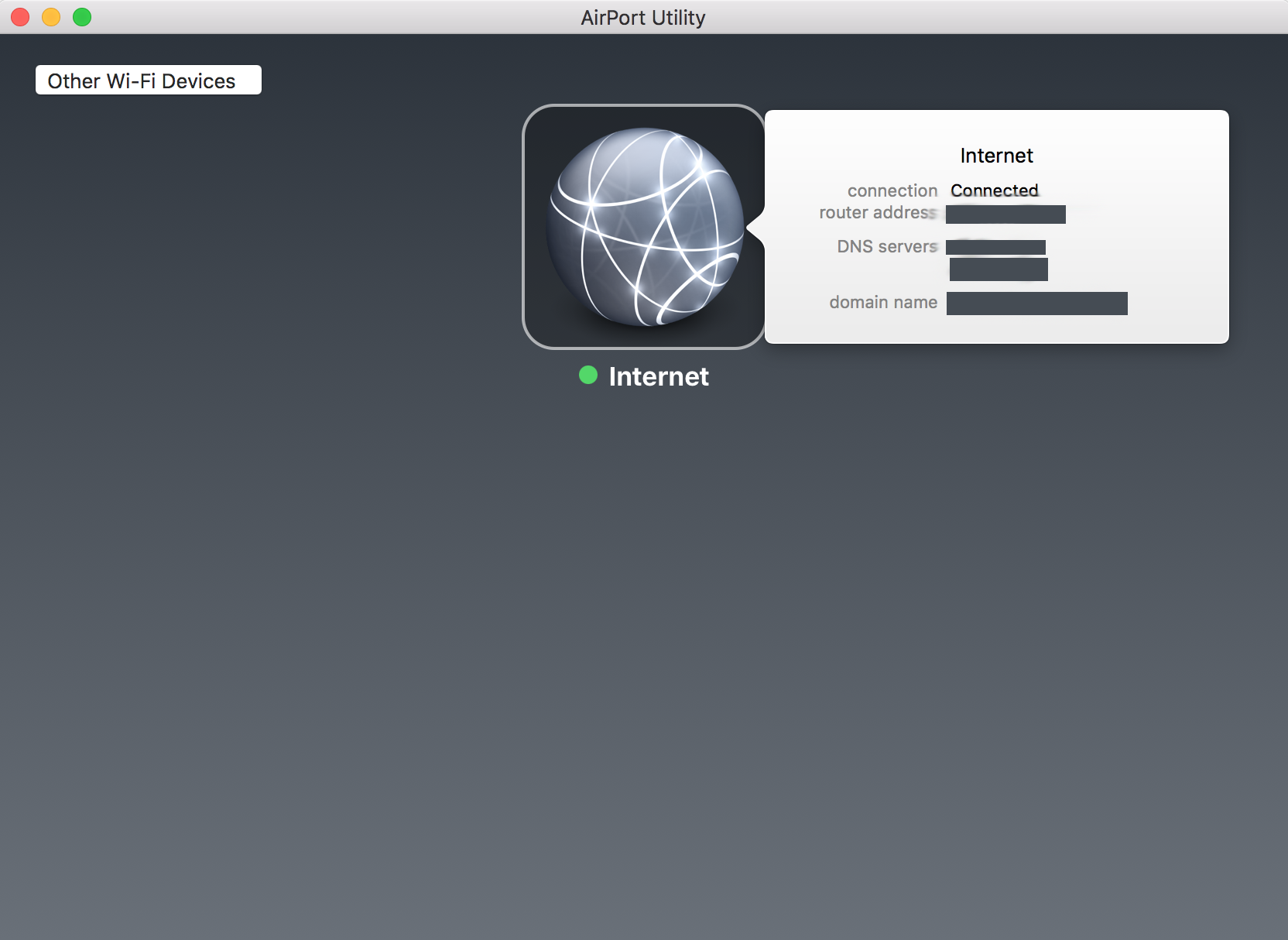 "I did get an Apple tech on the phone after I first wrote and he had me reset the device by pressing the reset button next to the power cord. That seems to have corrected the problem and the Airport icon has shown the two green lights (internet and device) since the reset was completed."