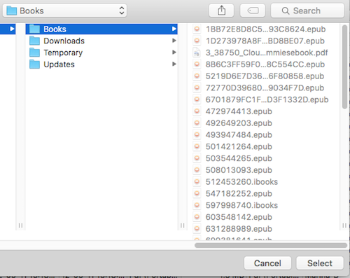 Go to ~/Library/Containers/com.apple.BKAgentService/Data/Documents/iBooks/Books and click Select.