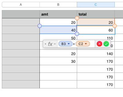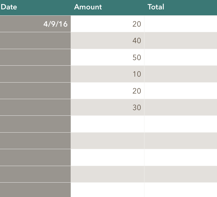 So as an example, I would like an equation that would add in the cumulative total in the right hand column, so that every time I added a figure under amount, it would automatically calculate the total to this point in the adjacent cell.