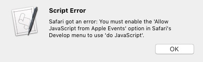 One then enables Allow JavaScript from Apple Events from the Safari Develop menu, at the cost of a user password prompt when the AppleScript is run.