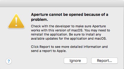 I have been using Aperture on my old Imac mid 2007, running El Capitan without any issues (at least I haven't noticed any). Recently I bougtht Imac 2017, 5k, running Sierra. I noticed that 'f' for full screen crashes the app only when the display is set in the native resolution on the new Imac. In scaled down resolution it works fine.