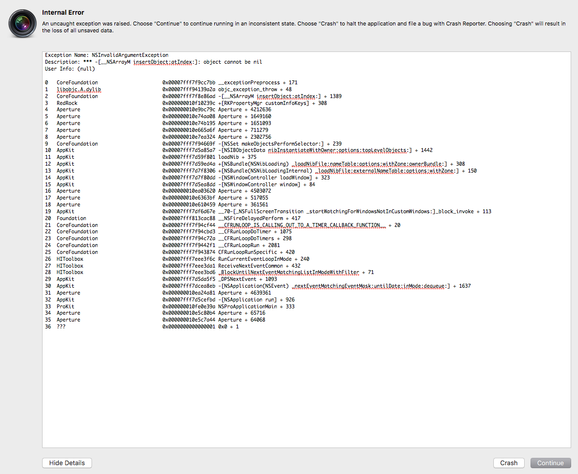 And the only way to get back to work is to hit "Crash" in the dialog box, to close Aperture and than open it again.