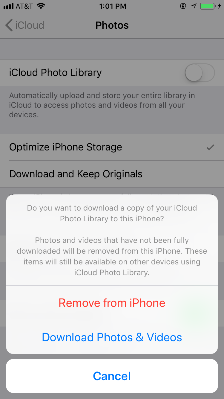 Can you please explain exactly what you mean by Settings > iCloud > slide off syncing? I’m using iOS 11.2.1, so maybe it’s different? I went to Settings > iCloud and I don’t see anything that says “syncing”. I have tried everything else, and when I read this I tried to follow your instructions, but I don’t see “syncing”. I clicked on Photos after going to Settings > iCloud and I tried to turn off iCloud Photo Library, but it gave the screen that I’m attaching as a screenshot. I obviously don’t want to take the chance of losing any of my photos, and this would be very time consuming. If I’m missing something, please tell me what I’m missing. I’m having a lot of trouble with this lately and it’s becoming very frustrating because it interferes with my work. Thanks so much!