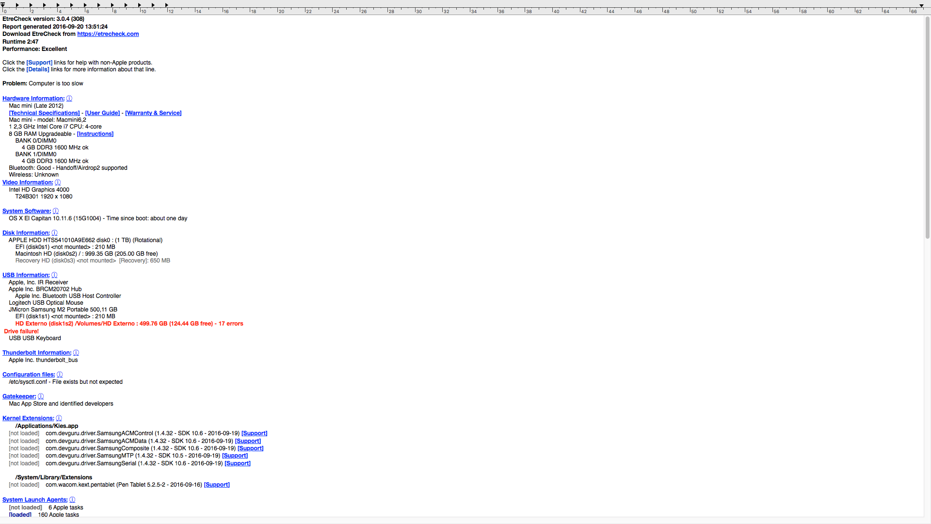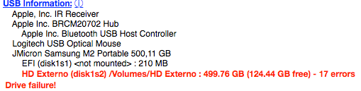 For the record, I wouldn't take it as gospel than an external USB 2 device has failed if you get these kinds of errors. EtreCheck just reports that there were kernel I/O errors. With internal hard drives that are known to fail after 2-3 years, a failed drive is a pretty good guess. But externals? I just don't know. They also fail on a regular basis, especially portable ones. But they are also much more likely to be affected by software and USB issues. The drive itself could be fine.