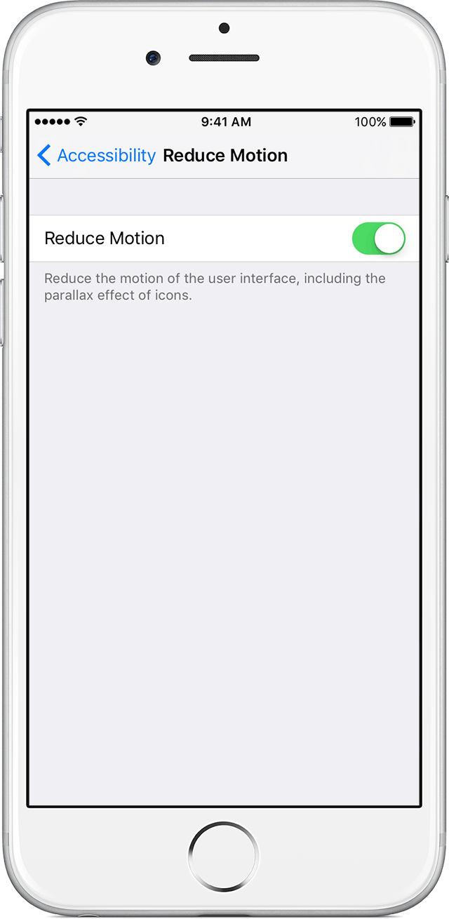 iOS uses motion effects to create the perception of depth on your Home screen and within apps. If you have sensitivity to motion effects or screen movement on your iPhone, iPad, or iPod touch, you can use Reduce Motion to turn off these effects.