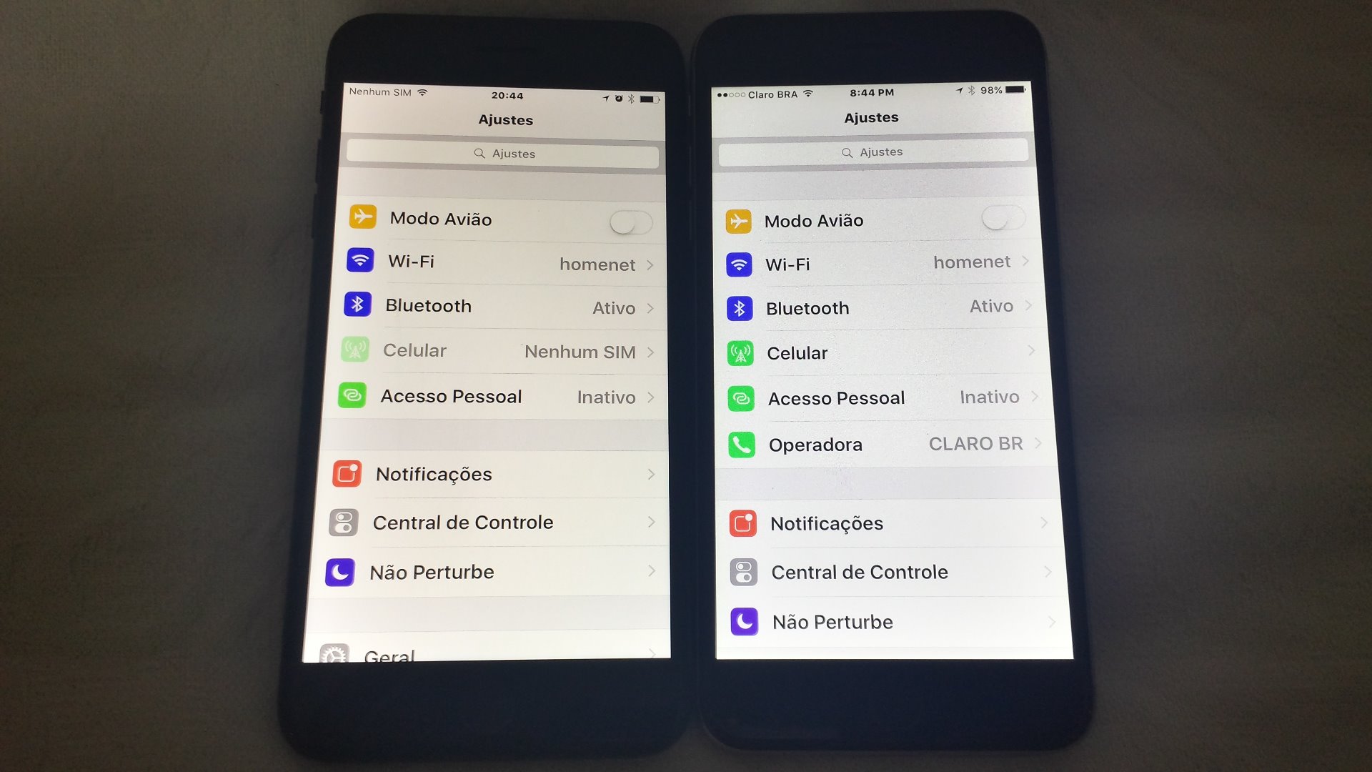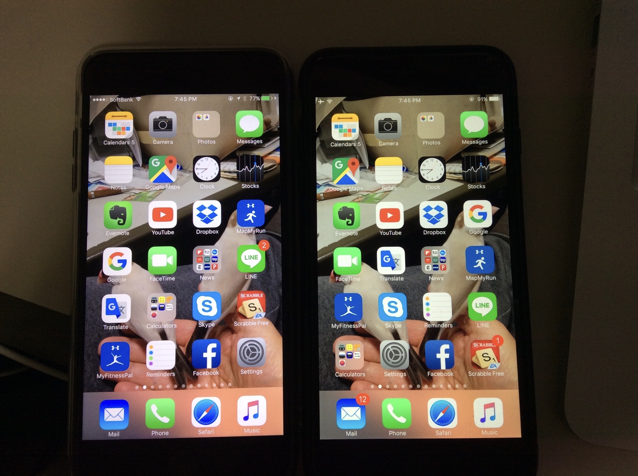 In the meantime, this is what my iPhone 7 Plus, on the left, looks like next to my iPhone 6 Plus, on the right. This is after that hue tweaking, and the brightness level is set to about 80% of max, rather than full max.