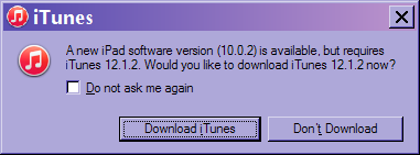 I have an older PC with Windows XP, Media Center, SP3 (cannot afford to update or buy a new PC...on disability 8+ yrs). It has iTunes 12.1.3.6 installed. Every time I try to update my iPad or iPhone to iOS 10, iTunes indicates that I need iTunes v12.1.2 and offers me a button to download it, but when I click it, nothing happens.