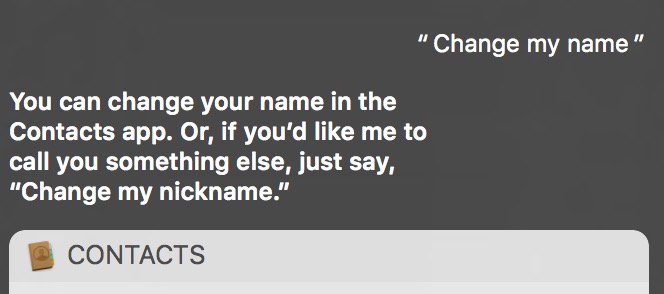 Just completed macOS Sierra installation and Siri works fine except that it thinks I'm my daughter. When I ask "who am I?", it gets it wrong and displays my daughter's card. When I ask about myself, it shows my card (even marked as "self") as if I was just another contact.