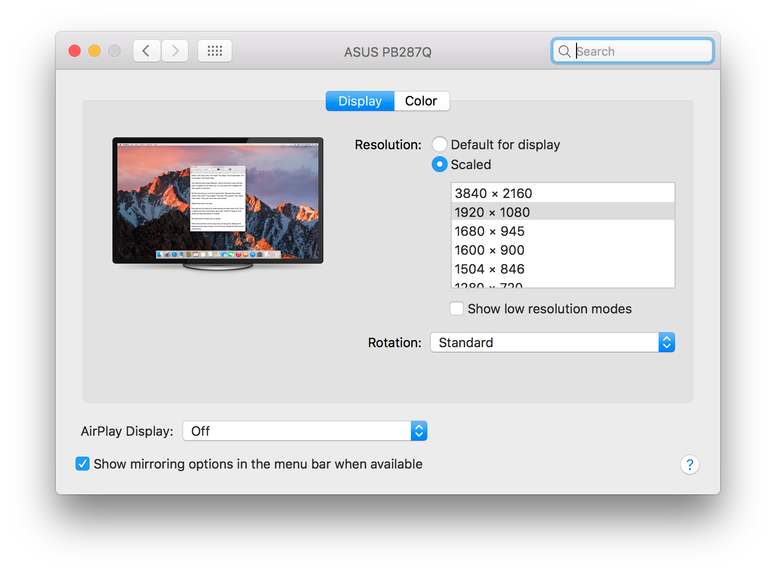 I have a 2015 Retina MacBook Pro with an external 4k display (Asus PB287Q) and since updating to Sierra yesterday, I can no longer select scaling "resolutions" that are between 1920x1080 and 3840x2160. HD is way too big, 4K way too small. Please let there be a solution to this... I tried rebooting, and it actually brought back the correct options until I closed the lid, and now they are gone and won't come back.