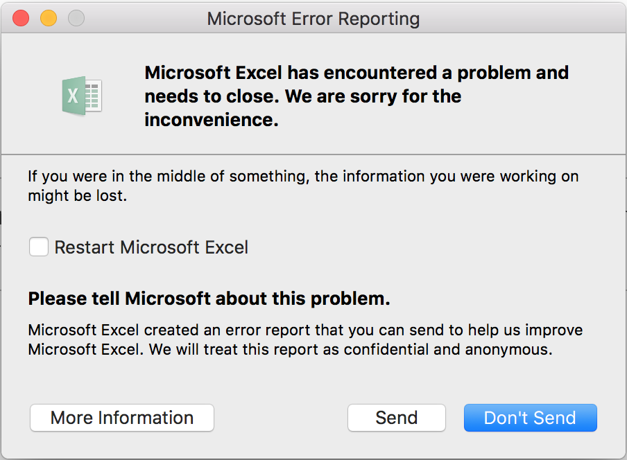 I am facing an issue since i updated the os from El Capitan to Sierra last night, when you open Excel or Word it shows an error report, "Microsoft Excel has encountered a problem and needs to close"