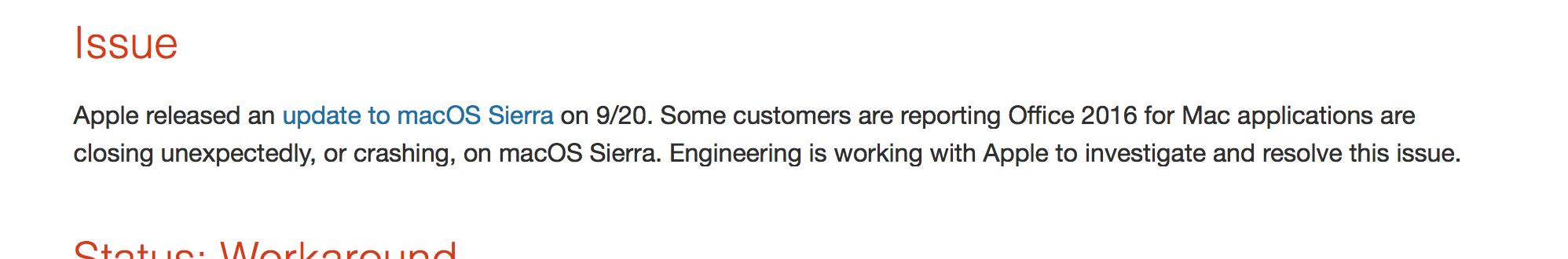 I am facing an issue since i updated the os from El Capitan to Sierra last night, when you open Excel or Word it shows an error report, "Microsoft Excel has encountered a problem and needs to close"