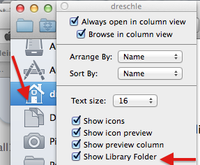 - Select the "Home" folder icon (the little house) in the Finder's sidebar and press the key combination ⌘J to open the "view options". Enable "Show Library Folder".