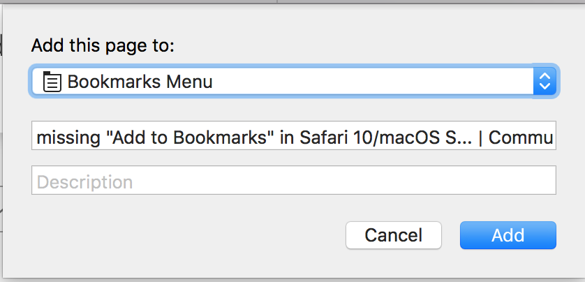 missing "Add to Bookmarks" in Safari 10/macOS Sierra