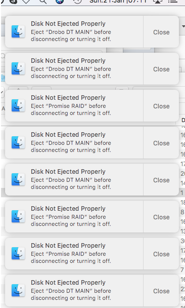 But eventually I kept getting the messages more frequently. And one of the disks (Time Machine) would not remount. I brought it to a tech repair shop which reported there were quite a few unreadable sectors. They could not restore the disk, but if I wanted they could try to copy one or two items. I gave up on the disk.