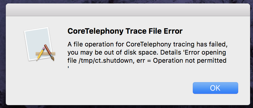 coretelephony trace file error a file operation for coretelephony tracing has failed, you may be out of disk space. details 'error opening file /tmp/ct.shutdown, err = operation not permitted