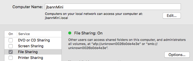 The one thing that I have noticed is that the computer name will not change no matter what I do on the Mini. It keeps showing smb://unknown#.