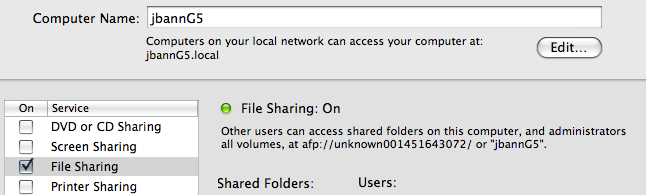 I can share between the two Macs fine, and between the Lenovo and G5. I can share from the Mini to the Lenovo via smb (cmd+k [IP]) but not the Lenovo from the Mini. On the Windows machine, I can see the Mini in the sidebar and the name is "jbannMini" as it should be, but it just will not connect to it. It keeps giving me a user or network password error. All usernames/passwords/workgroups match. All machines have static IPs on LAN.