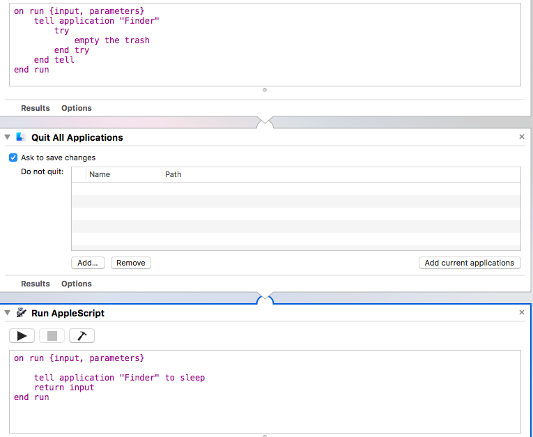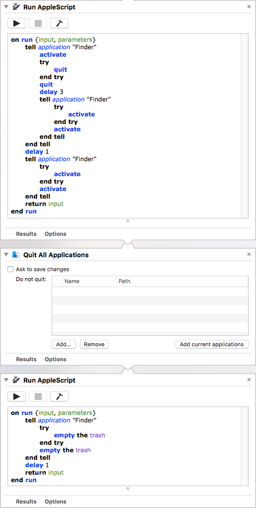 I can close Finder components as a group inside Automator, but combining that group with 'Quit all Applications' The Automator group of scripts fails to close Finder components (Finder window, Get info, and Inspector).