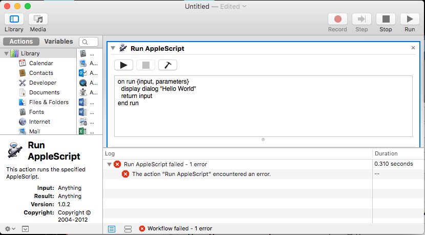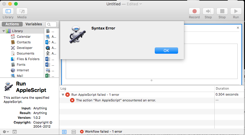 Unable to execute any AppleScript in Automator :: "Syntax Error"
