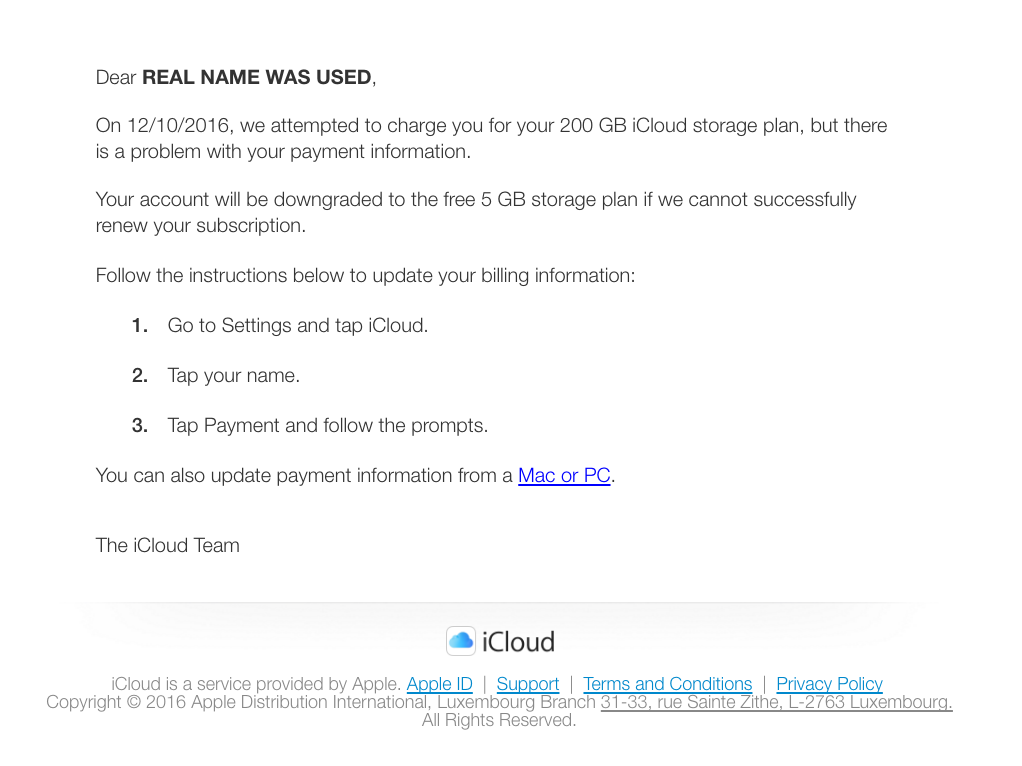 It was titled: Update your iCloud billing information to keep your storage upgrade.