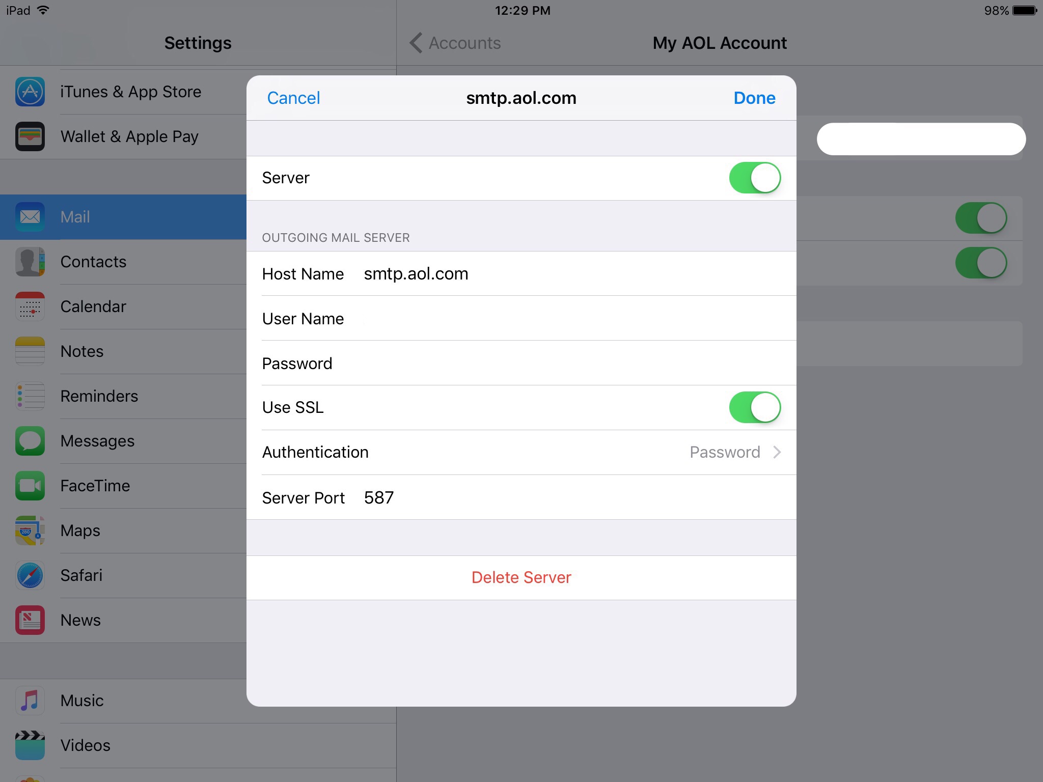 The server port isn't 587...it's 465 (same as the other iPad in which AOL mail is working).