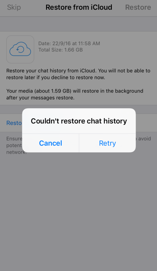 I lost my iPhone 6 Plus some weeks ago, but I have a backup on my WhatsApp in iCloud. Now when I install WhatsApp, after the initial configuration using the same Phone number I usually use, it gave an option to restore from iCloud. Tapping on it initiated a download of chat messages and when it reaches 100%, it gives an error saying "Couldn't restore chat history" with an option to either click Retry or Cancel.
